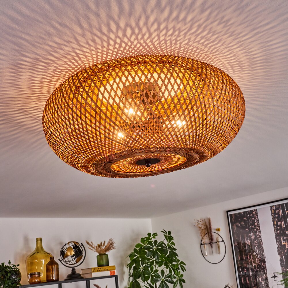 Inspired by bohemian artisanal aesthetics, this Bauro ceiling light embraces the intricacy of woven bamboo and warm ambient lighting. Crafted with handwoven bamboo elements, it showcases the art of textural artistry, resulting in a captivating interplay of natural fibers and patterned illumination. The three-light source configuration adds a rich, inviting touch, making it a standout focal point for living rooms, dining areas, and boho-inspired interiors.