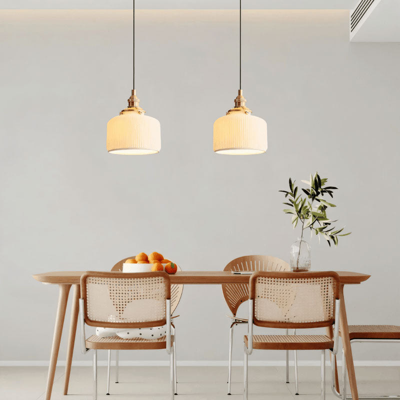 The Arla Pendant Light is a modern light fixture crafted from copper and ceramic, combining durability withelegance. lts ribbed cylindrical ceramic shade diffuses light softly, while polished copper accents add a refinedcontrast. Designed for Pendant installation, it provides focused downward illumination ideal for bedside tablesdining areas, or living spaces. This fixture blends timeless style with functional lighting, making it a versatile choicefor contemporary interiors.
