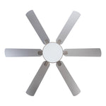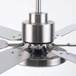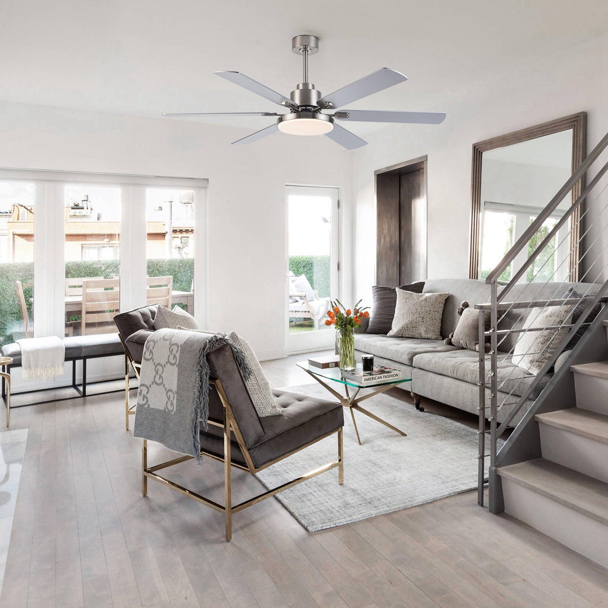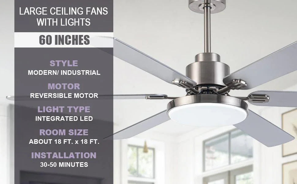 Enjoy a refreshing breeze with this 60" ceiling fan. The contemporary styling and brushed nickel steel finish incorporate well into many decors, and its high-efficiency blade pitch allows greater air movement. This single-mount fan includes a 4-in and10-in down rod for added convenience and ease of installation. Featured 6 fan blades. Use included handheld remote control to easily change the speed of the reversible.